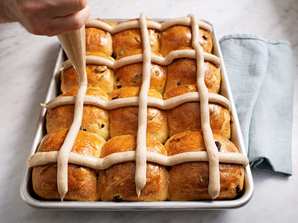 This recipe was developed by Bouchon Bakery's head baker, Matthew McDonald. The buns are loaded with currants and cranberries and piped with an icing spiced with cinnamon and cardamom. It's the beguiling addition of cardamom to just the right amount of cinnamon in the icing, and the way the spices play off the fruit, that gives these buns their zing. Hot cross buns are an English tradition on Good Friday, but they're so good we hope you'll make them all year round.